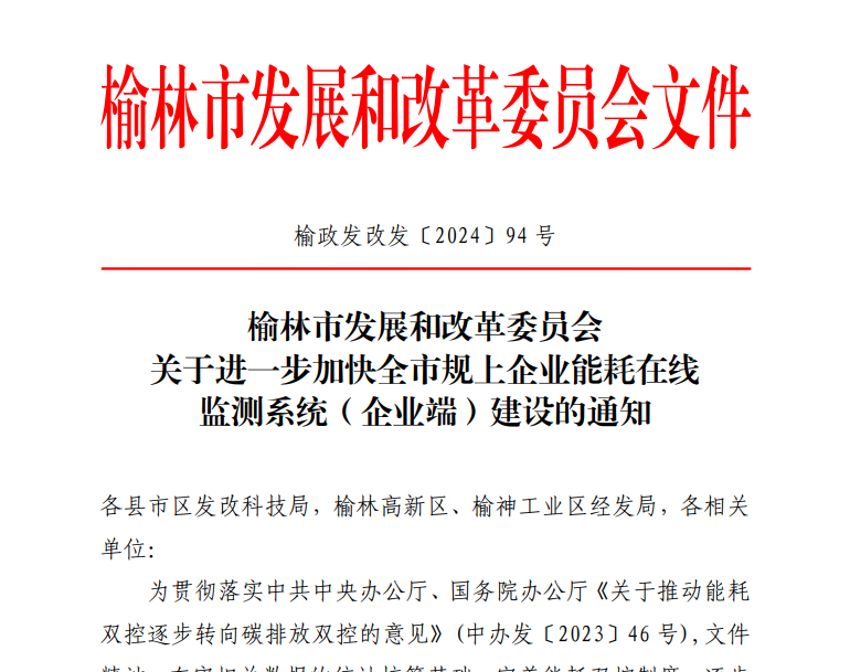 根據(jù)榆林市發(fā)展和改革委員會下發(fā)的文件通知,為加快推進(jìn)榆林市重點(diǎn)用能單位能耗在線監(jiān)測系統(tǒng)平臺建設(shè),要求榆林市各企業(yè)年消耗 1000 噸標(biāo)準(zhǔn)煤以上或消耗電力 500 萬千瓦時以上的新建項(xiàng)目,在入統(tǒng)前均要接入市平臺,實(shí)現(xiàn)一級計(jì)量能源消耗和外供數(shù)據(jù)的實(shí)時采集。
