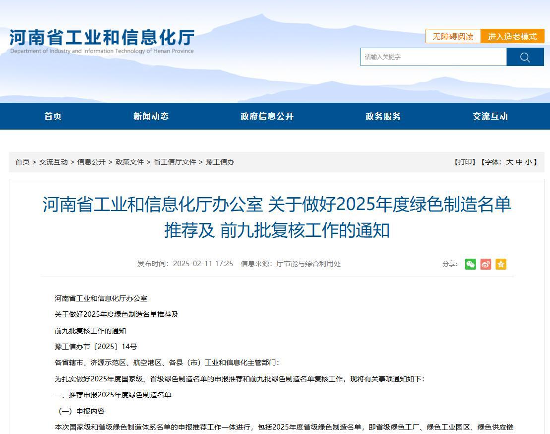 為推動河南省綠色制造體系的不斷完善,綠色制造水平的穩(wěn)步提高,河南省及各地市先后出臺了一系列政策文件。省工信廳組織開展2025年度河南省綠色工廠、綠色工業(yè)園區(qū)申報工作。