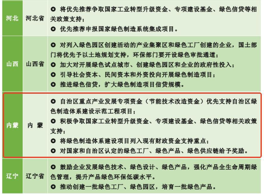 關(guān)于綠色工廠,不同的省市都有不同的鼓勵(lì)性政策補(bǔ)貼,下圖內(nèi)蒙古省的政策補(bǔ)貼: