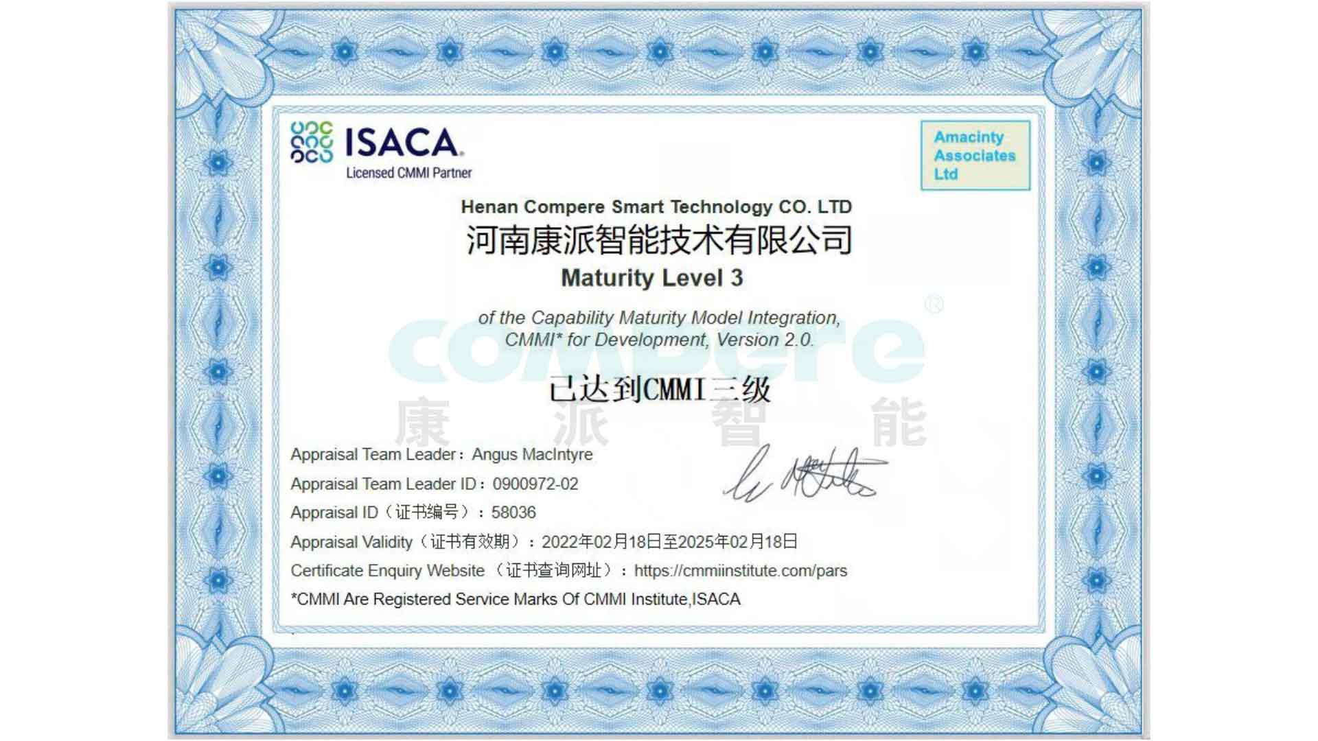 經(jīng)ISACA(國際信息系統(tǒng)審計(jì)協(xié)會(huì))的全面評估與審核,河南康派智能技術(shù)有限公司順利通過CMMI2.0-L3級認(rèn)證!