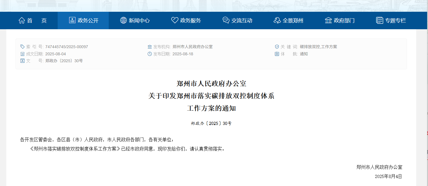 近日,鄭州市人民政府辦公室印發(fā)鄭州市落實碳排放雙控制度體系工作方案的通知。